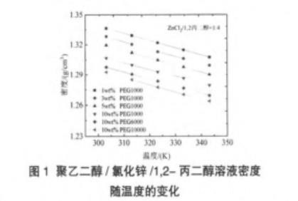 图1聚乙二醇/氯化锌/1,2-丙二醇溶液密度随温度的变化