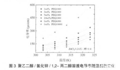 表2聚乙二醇/氯化锌/1,2-丙二醇溶液电导率随温度变化