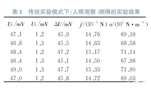 在用拉脱法测量液体表面张力系数实验中,最关键实验数据是记录金属环拉断液柱前的瞬间数字电压表读数U1和拉断液柱后的数字电压表读数U2;在实际的实验过程中,学生需要一边观察金属环与液体表面的连接情况,一边又要观察实验仪器上显示面板的数值变化,而金属环与液面是瞬间脱离的,学生需要紧盯显示面板观察记录电压值的变化。由于“拉断液柱”的过程变化太快,因此导致数字电压表的数据变化也很快,仅依靠人眼睛观察,很可能会来不及记录数据的变化,或者记录数据的时刻不够准确,从而增加了读取数据的偶然因素,导致实验误差过大[10-14]。此外,在这种模式下,学生对实验过程中表面张力的变化趋势(电压值变化趋势)并没有直观地了解,难以发现其变化规律,也不了解各个阶段拉力的具体变化。
