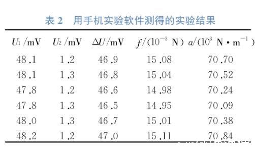 利用改装后的液体表面张力系数测量仪和手机实验软件记录实验数据,实验数据可在手机屏幕实时显示,拖动手机屏幕找到“拉断液柱”时所对应的数据,测得的U1和U2数据如表2所示。