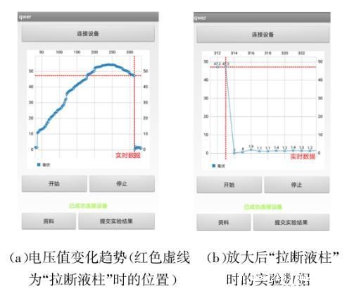 针对传统实验模式中记录数据的缺点,在智能手机上开发了专门的实验软件,通过手机的蓝牙连接到实验仪器,将实验所采集到的所有电压表读数实时传送到智能手机上,然后在智能手机上以坐标点的形式描绘出电压表读数的变化,在智能手机端就可以观察到金属环与液面分离瞬间的数据变化,很方便地读取到“拉断液柱”瞬间的实验数据。