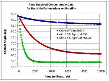 每种配方的初始接触角大约为90°,原始配方平衡接触角为86°,添加了Agrosurf SSP后的农药,平衡接触角降到61°,而添加了Agrosurf NEC38后,接触角降低更快,平衡后为54°。