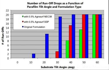 原始配方中超过一半以上的液滴在20°的倾斜角滚落,40°时,全部液滴滚落。Agrosurf NEC38比Agrosurf SSP更有效,可防止所有液滴在30°时滚落,避免60%的液滴在40°滚落。客户可根据这种方法,寻找更加优异的表面活性剂。