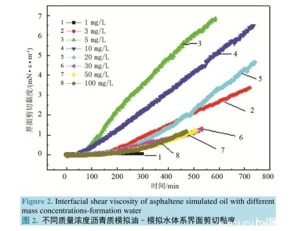 界面剪切黏度的大小取决于油水界面是否有稳定的膜结构形成,以及成膜分子排列的紧密程度和成膜分子间相互作用力的大小。界面剪切黏度的大小可以反映油水界面膜的强度大小,界面剪切黏度越高,原油乳状液越稳定。