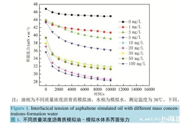 图1.不同质量浓度沥青质模拟油–模拟水体系界面张力