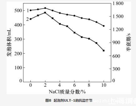 利用抗NaCl污染的能力评价质量分数为0.2%起泡剂ULT-1水溶液的抗盐性能。在室温下,称取0.2 g起泡剂ULT-1于搅拌杯中,加入100 mL蒸馏水,置于搅拌器之上,以转速11 000 r/min搅拌1 min。直接加入一定量的NaCl,以转速11 000 r/min搅拌1 min,测量发泡体积和半衰期。通过改变NaCl的质量分数测量起泡性能,结果如图8所示。从图8可知:当NaCl质量分数在2%以内时,发泡体积和半衰期缓慢增大,当NaCl质量分数继续增大时,发泡体积和半衰期缓慢降低;当NaCl质量分数达10%时,发泡体积和半衰期仍能保持较高水平,表明研制的新型起泡剂ULT-1具有较好的抗盐性能。