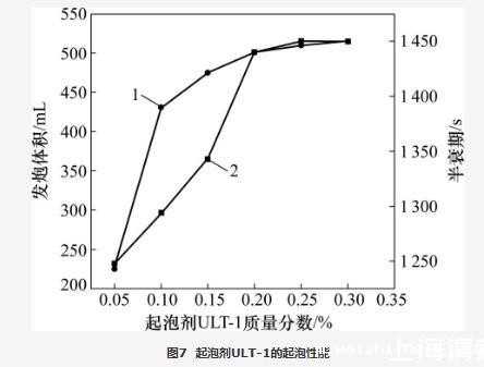 起泡性能主要是指起泡能力和泡沫稳定性。发泡体积V0反映了起泡能力,析液半衰期t1/2反映了泡沫稳定性。在室温下,称取一定质量的起泡剂ULT-1于搅拌杯中,加入100 mL蒸馏水,置于搅拌器之上,以转速11 000 r/min搅拌1 min。搅拌完毕后,立即取下搅拌杯,同时启动秒表,开始记录消泡时间,将搅拌杯中的所有物质全部倒入1 000 mL量筒中,读取发泡体积和从泡沫中析出50 mL液体的时间,即为半衰期。通过改变起泡剂ULT-1的质量测量起泡性能与起泡剂质量分数的关系,结果如图7所示。从图7可知:随起泡剂ULT-1质量分数的提高,发泡体积增加幅度较大,半衰期缓慢增加。当ULT-1质量分数升到0.2%时,发泡体积达到501 mL,半衰期达到1 440 s,继续提高质量分数发泡体积和半衰期基本不变,表明研制的新型起泡剂ULT-1低浓度时即具有较高的起泡性能,发泡体积高,泡沫半衰期长。同时,对比评价了常用起泡剂的半衰期,结果如表1所示。从表1可知:质量分数为0.2%的起泡剂ULT-1与质量分数为0.5%的常规起泡剂相比,泡沫半衰期可提高3倍以上。