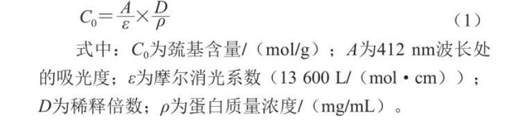 式中:C0为巯基含量/(mol/g);A为412 nm波长处的吸光度;ε为摩尔消光系数(13 600 L/(molgcm));D为稀释倍数;ρ为蛋白质量浓度/(mg/mL)。