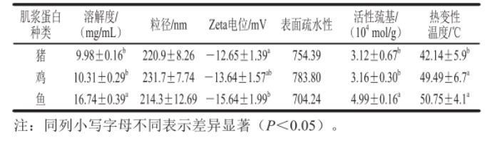 表面疏水性同时又与其他指标有着密不可分的关系,例如热变性温度,因为适当的热处理会造成肌浆蛋白内部疏水基团暴露在蛋白质表面,从而使蛋白质的表面疏水性增强,这样就可以改善蛋白质的乳化活性和乳化稳定性。3种肌浆蛋白热变性温度都较低,在40~55℃之间,其中鱼肉肌浆蛋白变性温度最高而猪肉肌浆蛋白最低,且猪肉肌浆蛋白热变性温度与鸡肉和鱼肉间差异显著(P<0.05),而鸡肉与鱼肉肌浆蛋白间的变性温度无显著性差异。所以在肌浆蛋白的研究中,如何根据不同蛋白的变性温度差异,准确控制热处理的强度至关重要,本研究可给蛋白变性凝聚组装类的研究提供基础数据的参考。