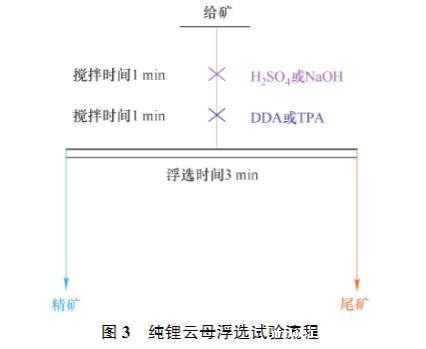 在XFG挂槽浮选机上进行纯矿物浮选试验,转速设为1 992 r/min。每次称取2.00 g纯矿物放入50 mL浮选槽中,然后加入40 mL超纯水,用H₂SO₄或NaOH调节pH值,搅拌矿浆1 min,加入一定量DDA或TPA,搅拌1 min,保持充气量恒定,充气1 min,用刮板刮出泡沫产品,每间隔3 s刮1次,浮选刮泡时间为3 min。结束后将得到的泡沫产品(精矿)和槽内产品(尾矿)分别烘干、称量、计算回收率。进行浮选pH及浓度试验时,每组试验设置1个平行试验,并对浮选结果求平均值。纯矿物浮选试验流程如图3所示。