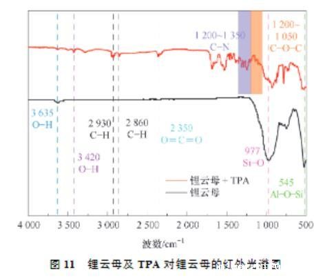 (2)接触角试验表明,同等条件下,TPA作用锂云母的接触角总是大于DDA,展现了TPA更强的疏水性。Zeta电位测试结果表明,TPA及DDA在锂云母表面的吸附为静电吸附,并且碳链更长的TPA由于疏水效应吸附性更好,进一步证明了TPA的强疏水性。FTIR及XPS进一步证实了TPA吸附在锂云母表面。