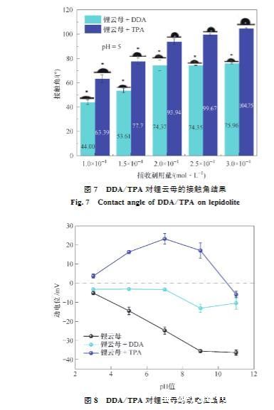 DDA及TPA的接触角结果如图7所示。pH值为5时,表征疏水性的接触角均随着捕收剂(DDA或TPA)浓度的增加而增大。图6(b)浮选浓度试验结果与图7接触角试验结果的变化趋势接近,说明捕收剂的浮选性能与疏水性大小关系密切。此外,相同浓度下,TPA作用后锂云母的接触角总是大于DDA作用后的,这也与图6(b)浮选浓度试验结果一致。与浮选试验类似,当药剂用量达到2.5×10⁻⁴mol/L时,DDA或TPA对锂云母接触角变化的影响较小。