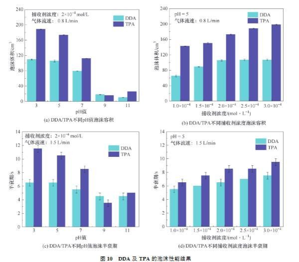(3)在不同浓度下,TPA均得到比DDA更低的表面张力,说明TPA可能具有更多的泡沫容积,泡沫容积结果验证了表面张力结果。在不同浓度下,TPA均得到比DDA更高的黏度,说明TPA产生的泡沫更稳定,泡沫半衰期结果验证了黏度结果。表面张力试验、黏度试验、泡沫容积试验、泡沫半衰期试验共同证明TPA更优越的泡沫性能。将TPA应用于浮选中,能够增大气泡与锂云母的碰撞及接触概率,增强锂云母与气泡的黏附,减少锂云母与气泡的脱附,进而提高浮选回收率。