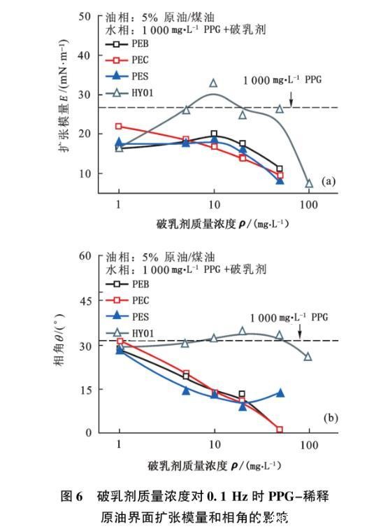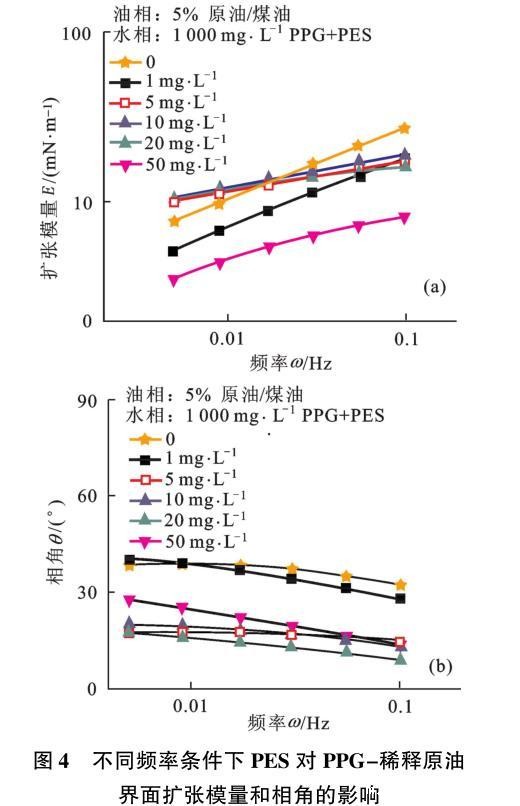图4不同频率条件下PES对PPG-稀释原油界面扩张模量和相角的影响