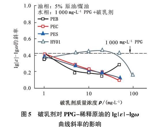 图5破乳剂对PPG-稀释原油的lg|ε|-lgω曲线斜率的影响