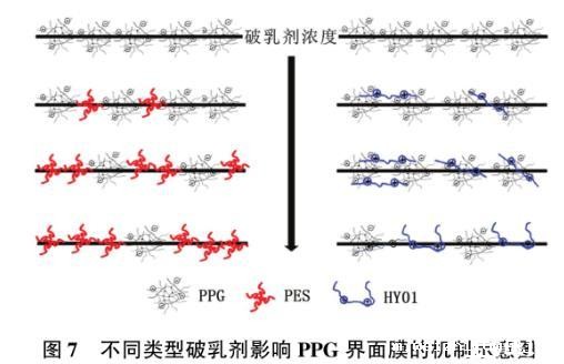 图7不同类型破乳剂影响PPG界面膜的机制示意图