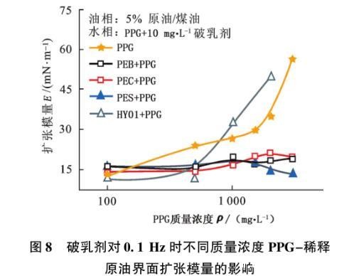 图8破乳剂对0.1 Hz时不同质量浓度PPG-稀释原油界面扩张模量的影响