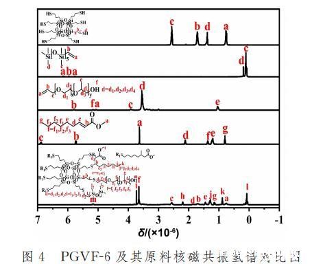 图4为PGVF-6以及其原料的核磁共振对比图。PGVF-6谱图中,SH-POSS上的-SH质子氢吸收峰已经消失,接枝成功的APEG750单体,烯烃双键的质子氢吸收峰已经消失,末端连接的-OH质子氢吸收峰在5.21times 10^{-6}处;同样反应成功的2-壬烯酸甲酯单体,烯烃双键的质子氢吸收峰也同样消失不见,连接O的末端烷烃-CH3质子氢吸收峰处于3.72x10-6的位置,末端烷烃-CH3的质子氢吸收峰在0.88x10-6处;最后成功反应的VDMS单体,烯烃双键的质子氢吸收峰也已经消失,后续Si上连接的所有甲基-CH3分别处在0.12x10-6和0.08x10-6处,可以得知PGVF-6杂化材料成功合成。
