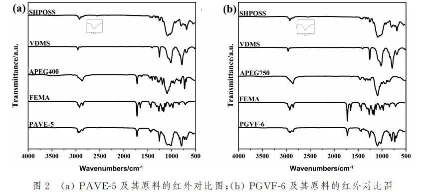 通过红外光谱对所制得功能材料的官能团化学状态进行表征分析,图2(a)和2(b)分别为PAVE-5和PGVF-6及其原料的红外吸收光谱图。PAVE-5和PGVF-6谱图中,能够清晰观察到处于2960cm-位置的CH3反对称伸缩吸收峰,处于2930和2860cm-1的CH2伸缩吸收峰,处于1720cm-位置的酯基C=O伸缩吸收峰,处于1256cm-1位置的C-O-C伸缩吸收峰,和处于1090和1010cm-位置的Si-O-Si吸收峰,而原本SH-POSS处的S-H吸收峰消失,VDMS、APEG400、APEG750和2-壬烯酸甲酯的单体C=C伸缩吸收峰也消失,表明PAVE-5和PGVF-6制备成功。
