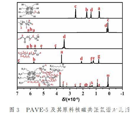 采用核磁共振氢谱对所制备复合材料的化学结构进一步表征分析。图3为PAVE-5以及其原料的核磁共振对比图。PAVE-5谱图中,SH-POSS的-SH质子氢吸收峰已经消失,接枝成功的APEG400烯烃双键的质子氢吸收峰已经明显消失,末端连接的-OH质子氢吸收峰在5.32x10-6处;同样反应成功的2-壬烯酸甲酯单体,烯烃双键的质子氢吸收峰也同样消失不见,连接O的末端烷烃-CH3质子氢吸收峰处于3.75x 10-6的位置;最后成功反应的VDMS单体,烯烃双键的质子氢吸收峰也已经消失,Si上连接的所有甲基CH3分别处在0.09x10-6和0.14x10-6处,可以得知PAVE-5成功合成。