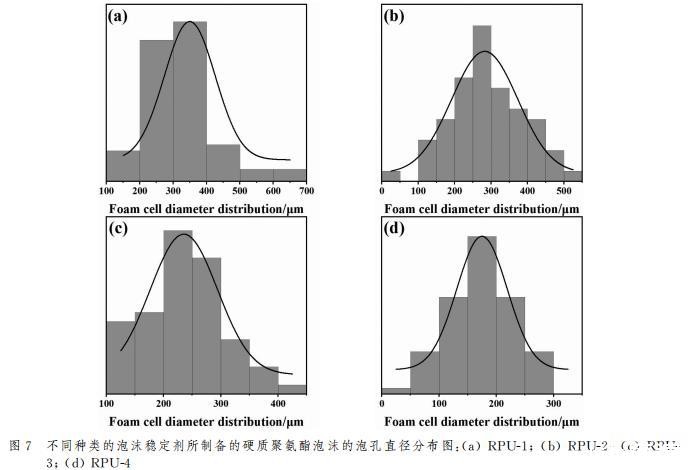 为了对聚氨酯泡沫孔径大小和分布情况进行量化,通过ImageJ软件对SEM测试结果进行处理分析,其孔径分布直方图如图7所示。通过泡沫的孔径分布直方图对比结果可以看出,添加国产-1的聚氨酯泡沫孔径分布范围在100~700μm,存在较大直径的泡孔,添加进口-2的聚氨酯泡沫泡孔直径分布范围在0~550μm,虽然分布范围有变窄,但也存在较大泡孔直径,添加PAVE-5的聚氨酯泡沫泡孔直径分布范围在100~450μm,泡孔分布范围减小,但仍然存在超过400μm的大泡孔,分布范围最窄的是添加PGVF-6泡沫稳定剂的硬质聚氨酯泡沫,分布范围在0~300μm,没有超过400μm直径的泡孔,泡沫泡孔直径得以减小,泡沫泡孔细小均匀。这种微观结构上的改善可能得益于在发泡过程中,接枝APEG的POSS可以作为三维网络结构的交联点,通过其与聚氨酯基体的相容性,亲水性-OH基团有助于形成更加稳定的泡沫结构。