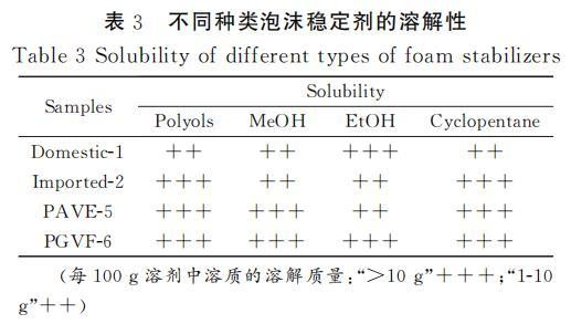 聚氨酯发泡过程中,各原料之间的相容性对泡沫的性能有重要影响。相容性好的原料可以确保发泡过程中的化学反应顺利且充分进行,从而获得均匀、细腻的泡沫结构,提高泡沫的物理性能和使用性能。表3是不同种类泡沫稳定剂在不同溶剂中的溶解性测试,通过测试结果可知,经过接枝改性后的PAVE-5和PGVF-6在多元醇和环戊烷中的溶解性较好,和国产-1、进口-2等泡沫稳定剂都能够很好的溶解在多元醇和环戊烷中。PGVF-6和PAVE-5在多元醇中表现出的优良溶解性主要得益于POSS接枝的APEG链段的醚键和羟基都具有明显的极性,这使得其分子间以及与其他极性分子间可以形成较强的极性相互作用。这种相互作用有助于分子间的相容性,对聚氨酯泡沫的形成和性能有积极作用。