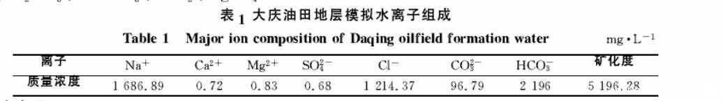 实验用油样为大庆原油与煤油按体积比9∶1混合而成(简称模拟油)。其中,大庆原油酸值为0.05 mg KOH/g;煤油由北京燕山石油化工有限公司提供,实验前用活化后的硅胶反复吸附处理,处理后与二次蒸馏水界面张力大于48mN·m—1.实验用Na2CO3弱碱溶液(简称Na2CO3溶液)由Na2CO3与蒸馏水配置,质量分数为0.53%.实验用水样为大庆油田地层模拟水(简称模拟水),离子组成见表1.实验所用试剂NaCl、Na2CO3、NaHCO3、CaCl2、MgSO4均为分析纯。