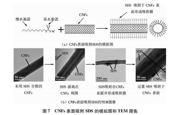 CNFs能够在水性体系中实现分散是由于表面活性剂分子在水溶液中会吸附或包裹在CNFs的表面,这种吸附或者包裹作用不会破坏CNFs的结构与形