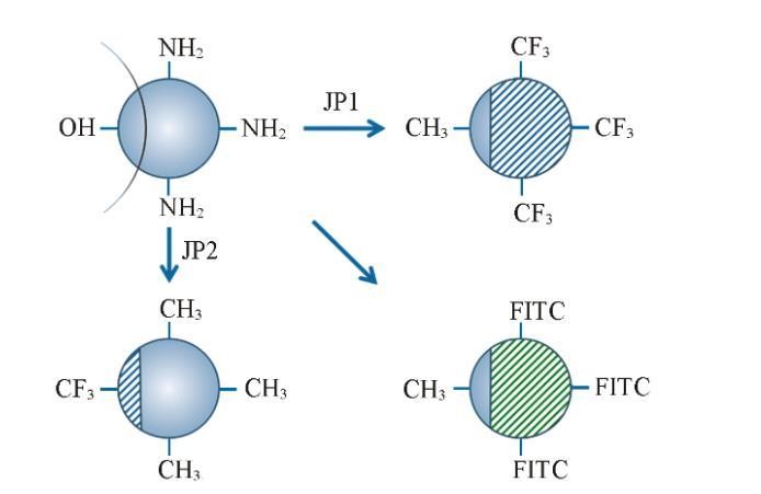 将具有APS和OTS的SiO₂颗粒分散在2.4×10⁻² mol/L PFOA的甲苯溶液中并搅拌48 h。通过蒸发除去溶剂,再多次离心洗涤,然后在110℃下退火2 h,将所制得的颗粒命名为JP1,制备过程如Scheme 1所示。
