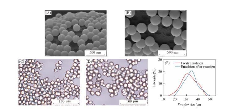 利用Pickering乳液进行选择性修饰是一种比较常用的Janus颗粒制备方法。由于裸露的SiO₂颗粒偏亲水,在Pickering乳液液滴表面的SiO₂颗粒仅包裹了少量石蜡[图1(A)和(B)]。这为使用一种Pickering乳液制备两种具有不同氟碳链与碳氢链覆盖面积比例的Janus颗粒提供了可能。