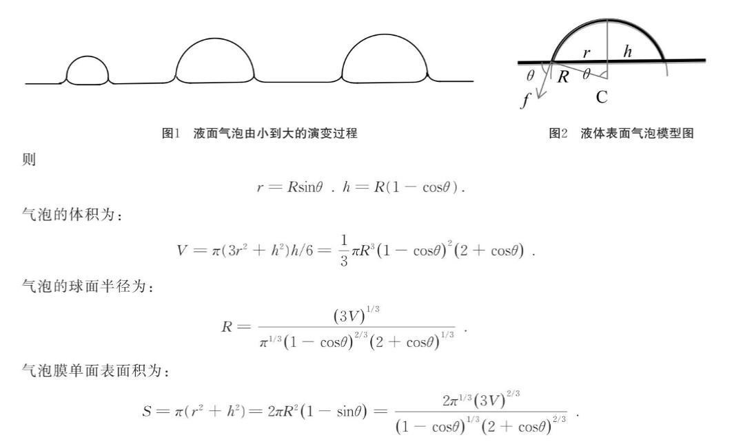 气泡一般是由于气体通过小孔浸人液体层后分散扩张形成的.在气泡形成过程中,由于液体表面张力的作用,使液膜呈收缩趋势.球形气泡的液膜表面积最小,所以,在没有其他因素影响的条件下,空中和液体中的气泡应处于球形的亚稳状态.当气泡落在液体表面或由液体内部上升到液体表面以后,没破裂的气泡不再呈现.球形状态,与液体表面直接形成的气泡一样,呈现球缺形状.液面气泡由小到大的演变过程如图1所示.当气泡足够大时,液体表面气泡实际形状接近半球,但在气泡与液体表面接触处可观察到气泡内、外均存在液面向上弯曲现象,且泡内水平液面相比气泡外水平液面位置出现微小凹陷.