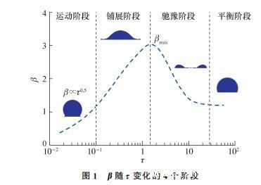 根据β随τ变化情况,液滴碰撞分为运动、铺展、弛豫和平衡4个阶段,如图1所示。在运动阶段(τ<0.1),惯性力占主导地位,液滴上部仍保持球状,下部铺展成楔形边缘,文指出该阶段可忽略流体性质影响,β随τ呈指数上升,即β∝τb,其中指数b介于0.45到0.57之间,一般取b=0.5;在铺展阶段,受黏性力或毛细力的主导作用,β逐渐增至βmax,然后液滴开始回撤收缩,进入驰豫阶段;在平衡阶段,液滴可能稳定铺展,也可能发生反弹,或者碎裂飞溅。本文主要针对运动阶段和铺展阶段进行研究。