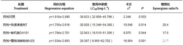 表3 3种助剂添加后螺虫乙酯防治石斛菲盾蚧室内毒力变化
