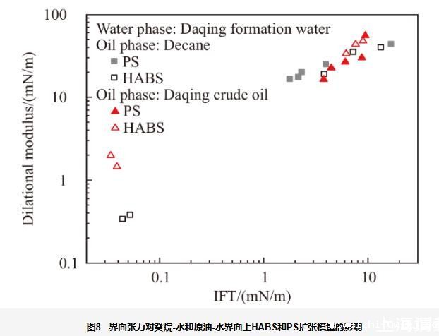 图8界面张力对癸烷-水和原油-水界面上HABS和PS扩张模量的影响