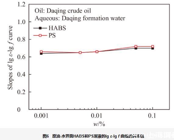 图6为PS和HABS在原油-水界面的lgε-lg f曲线的斜率。在原油-水界面,HABS的斜率与PS的斜率几乎相同,都约为0.7。这与图4中正癸烷-水界面的两种表面活性剂的曲线斜率明显不同。PS在原油-水界面的斜率值比在正癸烷-水界面的斜率值高,而HABS在原油-水界面的斜率值比在正癸烷-水界面的斜率值低。这是由于大庆原油的活性组分在界面上混合吸附,对界面膜的黏弹特性也有贡献。大庆原油属于轻质原油,原油组分中小分子量的石油酸组分较多,尺寸较大的沥青质较少。小分子量原油活性组分在界面上的吸附,一方面降低了分子尺寸较小的HABS体系的黏性,一方面增大了分子尺寸较大的PS体系的黏性。因此,在原油-水界面,HABS和PS体系lgε-lg f曲线的斜率相差不大。