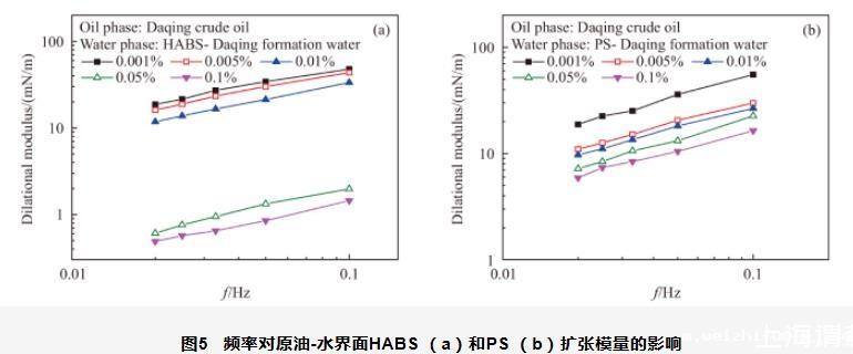 图5频率对原油-水界面HABS(a)和PS(b)扩张模量的影响