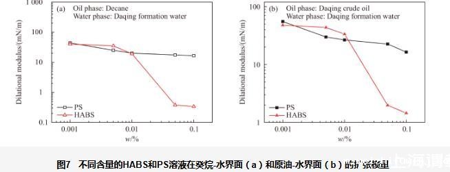 图7不同含量的HABS和PS溶液在癸烷-水界面(a)和原油-水界面(b)的扩张模量