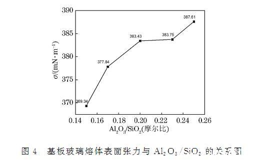随着OLED基板玻璃化学组成中Al₂O₃/SiO₂摩尔比从0.15变到0.25,玻璃熔体在T4温度条件下的表面张力测试结果如图4所示。