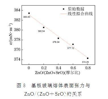 图8 基板玻璃熔体表面张力与ZnO/(ZnO+SrO)的关系
