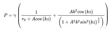 这里,是未受到扰动的水柱半径,A表征扰动的大小,而k是波数,表示扰动范围的大小。很容易,我们可以计算出两个方向的曲率半径,进而根据Young-Laplace方程计算出流体内部各处的压力(我们假定外压为零):