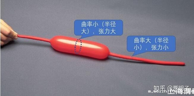 气球内部的气体压力处处相等,但是,接触过这种气球的人都有一个经验,就是粗的地方绷得紧,而细的地方绷得就不那么紧。如上图所示,绷得紧的地方和绷得松的地方,产生的压力差是相等的,但是他们的曲率是不相等的:曲率越大,同样的张力所能产生的压力差就更大。