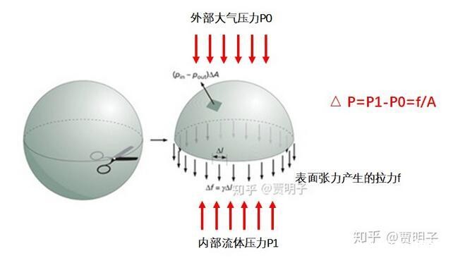 而这里有一件非常关键的事请,就是由于表面张力的存在,弯曲的表面就会在两侧形成压力差。就好像紧绷的气球,其内部压力要高于外部的压力。这种压力差来自哪里?当然就是气球皮膜紧绷的张力。由于气球的弯曲表面,使得其张力最终表现为内部压力的升高。