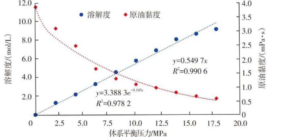 实验测定60℃和不同压力条件下CO2溶解度及原油黏度的变化特征。如图1所示,CO2溶解度与体系平衡压力呈近似线性关系,原油黏度与体系平衡压力呈近似指数关系。初始状态下,原油黏度为3.98 mPa·s,但当体系平衡压力上升到18 MPa时,原油黏度降低至0.59 mPa·s。