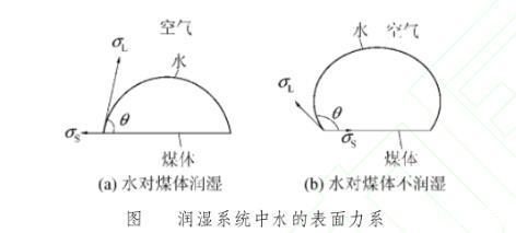 式中,θ为水与煤表面的接触角,它是指在固、液、气三相交界处,自固-液界面经液体内部而到液-气界面的夹角。如果接触角θ<90°属可湿润煤体,在相同的水表面张力系数条件下,θ角愈小,毛细作用力则愈大,增强了注水动力,润湿能力愈大;若湿润边角θ>90°属于不可湿润煤体,θ角愈大,润湿能力愈小。