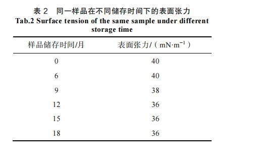 在温度为23℃、相对湿度为60%的环境下,测试样品在不同储存时间下的表面张力,测得数据见表2。由表2可知,样品转移涂层刚开始成膜时的表面张力为40 mN/m,且样品储存6个月以内的表面张力基本保持不变。7—9个月出现衰退,降低为38 mN/m,符合真空喷铝纸行业标准(BB/T 0054—2010)。储存12个月至18个月的纸样表面张力仅为36 mN/m,但并未在储存18个月时出现进一步的明显降低。显然,纸样的表面张力缓慢降低并不能解释2.1节中出现的18个月印刷油墨与转移涂层的附着力差的问题。再根据相关研究,表面张力≥38 mN/m的要求,并不直接适用于转移纸印刷的质量控制,特别是用于UV胶印的真空喷铝转移纸的转移涂层。胶印印刷适应性并不完全由表面张力所决定。