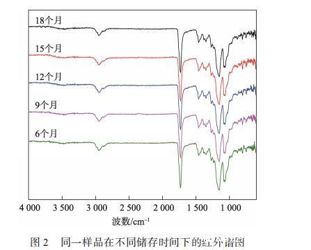 为了探究表面转移涂层是否发生了结构变化,对不同储存时间下的样品进行红外光谱测试分析,见图2。可以看出,储存时间为6—18个月的样品的红外谱图并未发生明显变化。谱图的一致性证明了喷铝纸表面转移涂层的基本结构并未随着时间发生明显变化,即掉墨现象的出现并非由于转移涂层出现结构变化导致。根据相关研究,喷铝纸在储存的时候,纸张及涂层中添加的助剂,环境介质中的水分子、油污和空气等小分子物质会通过吸附、扩散、迁移和凝集等作用,甚至键合等途径,在转移涂层表面形成低分子物质的富集区,即弱界面层,降低了转移涂层的表面张力,并使其印刷适性变差。