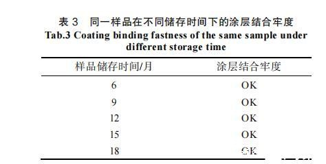 在温度为23℃、相对湿度为60%的环境下,测试样品在不同储存时间下的涂层结合牢度。在真空镀铝时,涂层是铝原子附着的载体,因此与铝原子的接触附着十分重要,而且要有利于铝原子附着和排列,这就要求涂层与铝原子有良好的结合力。使用3M810胶带平贴于纸面60 s后45°快拉,并在强光下观察表面涂层是否有脱落。测得数据见表3,所有样品涂层均未脱落。显而易见,纸样涂层的层间结合力及涂层与底纸的结合力在储存一年后依然符合相关要求,并未出现突然变差的情况,证明掉墨现象并非由涂层牢度不佳导致。