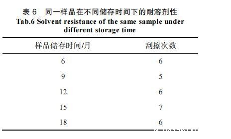 转移涂层的耐溶剂性是另一个重要指标。当印刷油墨与耐溶剂性差的涂层接触时,涂层的表面结构会被溶剂侵蚀,既会影响纸张表面光泽性,又会导致脱墨现象。为了研究硅含量的增加对涂层的耐溶剂功能性是否发生影响,在温度为23℃、相对温度为60%的环境下,使用棉棒蘸取乙酸乙酯,人工刮擦储存6—18个月的样品的表面涂层,观察涂层露底变白时的刮擦次数,刮擦次数越多证明转移涂层耐溶剂性越好,测得数据见表6。可以看出,不同储存时间下的样品刮擦次数均在5~7次,并没有出现明显的升高或降低现象,证明转移涂层的耐溶剂性并未随着时间变化而变化,硅含量的增加对涂层的耐溶剂性并未发生影响。