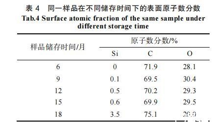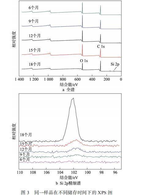 为了探究喷铝纸表面析出的小分子物质的成分,笔者通过XPS分析储存时间为6个月、9个月、12个月、15个月、18个月纸张表面元素的变化,见图3a。在XPS光谱图中,可以观察到C 1s,O 1s的特征峰,结合能分别为285.1、532.3 eV。第18个月纸张的XPS光谱图中,出现了Si 2p的特征峰,结合能为102 eV。由图3b和表4可知,6—15个月硅含量逐渐增加,元素原子数分数由0增至0.6%,但均未出现成型的峰。18个月的纸张表面硅原子数分数剧增为3.5%。这表明随着储存时间增加,纸张表面逐渐有含硅的无机小分子析出。此外,由表4也可看出,18个月的样品表面C原子数分数明显升高,从69.9%升至75.1%,O原子数分数则由29.5%降低至20.0%,证明硅主要以Si−C键的形式存在,析出的有机硅形成了低分子物质弱界面层,降低了样品涂层的表面张力。