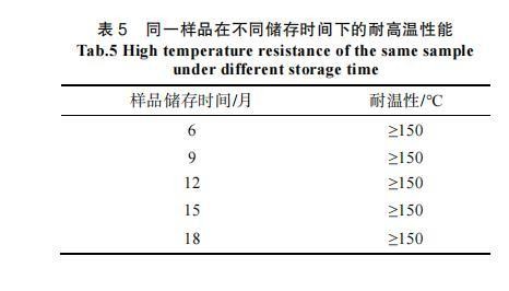 转移涂层作为铝层的保护层起到隔离保护的作用,在后期的镭射模压、印刷工序中需经受温度、摩擦、溶剂环境,转移涂层需耐温、耐摩擦、耐溶剂侵蚀才能保护铝层的持久光亮、不起皱、不氧化,因此,转移涂料对耐温性也会提出要求。当涂层耐温性较差时,瞬间的高温高压都会使纸张表面发白发雾,影响表观效果。笔者使用五点热封仪,测试储存6—18个月的样品的耐温性,测得数据见表5,所有样品耐温性均≥150℃,证明转移涂层的耐温性并未随着时间和硅含量的增大出现明显变化,不会影响成盒效果。